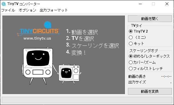 注意:TinyTV DIY Kitキット(2023年夏以前に発送されたもの)に動画を変換して読み込みたい場合は、TSV Converterアプリのチュートリアルをご参照ください。